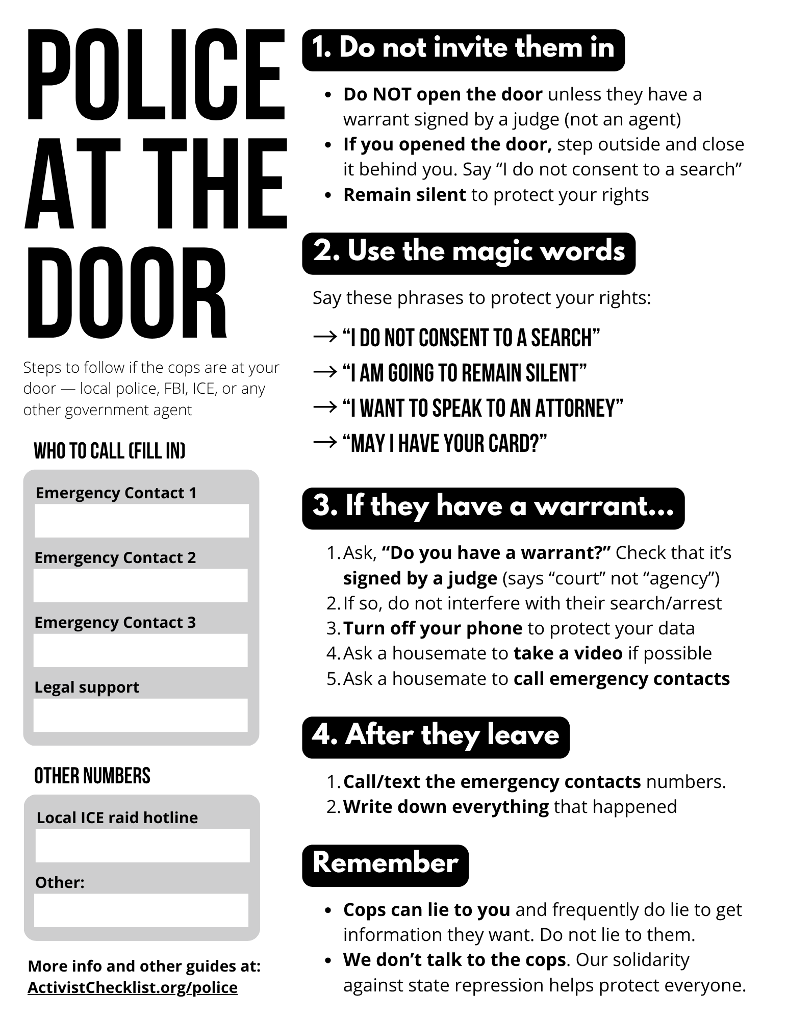 We created this poster to provide an actionable set of steps for folks to follow if any government agents are at your door (FBI, ICE, DHS, local cops, etc).